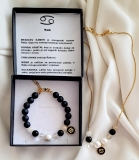 Komplet (narukvica i ogrlica) od hirurškog čelika i odgovarajućeg poludragog kamenja: onijs,gorski kristal, mesečev kamen, biser, vulkanska lava. Uz komplet i objašnjenje za svaki kamen